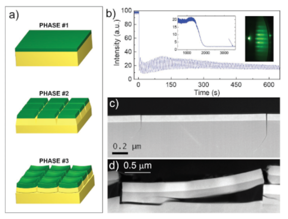 Our approach to membrane formation is based on strain engineering. By preserving the strained growth of LAO and STO well above expectations from elastic theory, we induce a devastating strain relaxation process that fragments the surface in self-formed, regularly shaped LAO/STO micro sized freestanding heteromembranes. A sketch of the process is shown in Fig.1a. The long lasting RHEED oscillations in regime of strained growth are reported in Fig.1b. Low-resolution electron microscopy HREM images of the two steps of the breaking mechanism are shown in Fig. 1c,d.