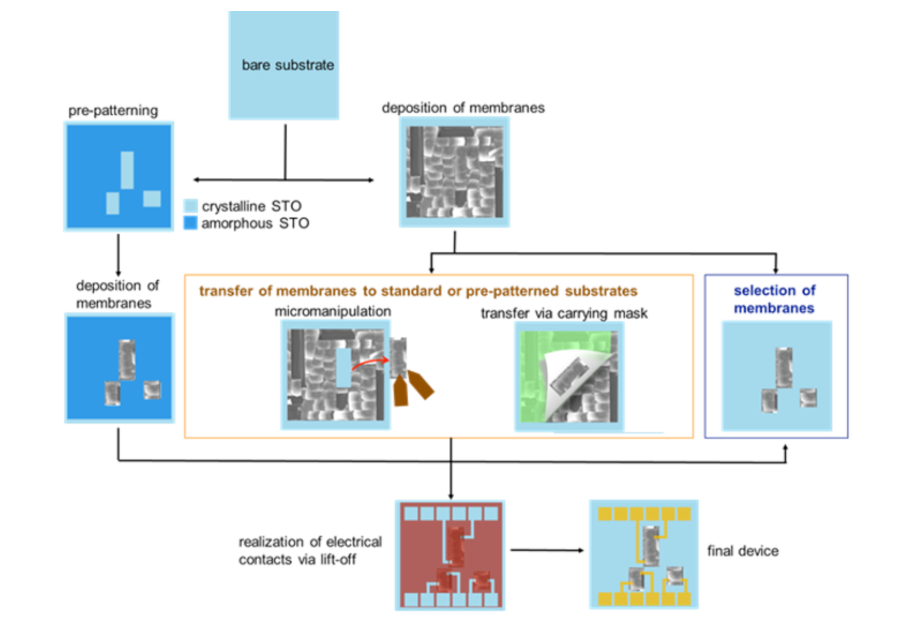 Our activity will include the preparation of prepatterned substrates for the controlled growth of membrane matrices with predefined shape, deterministic placement of membranes on chip and realization of the contacts. We will explore differeFOXESnt ways to realize membrane-based devices, as summarized in Figure 3.
